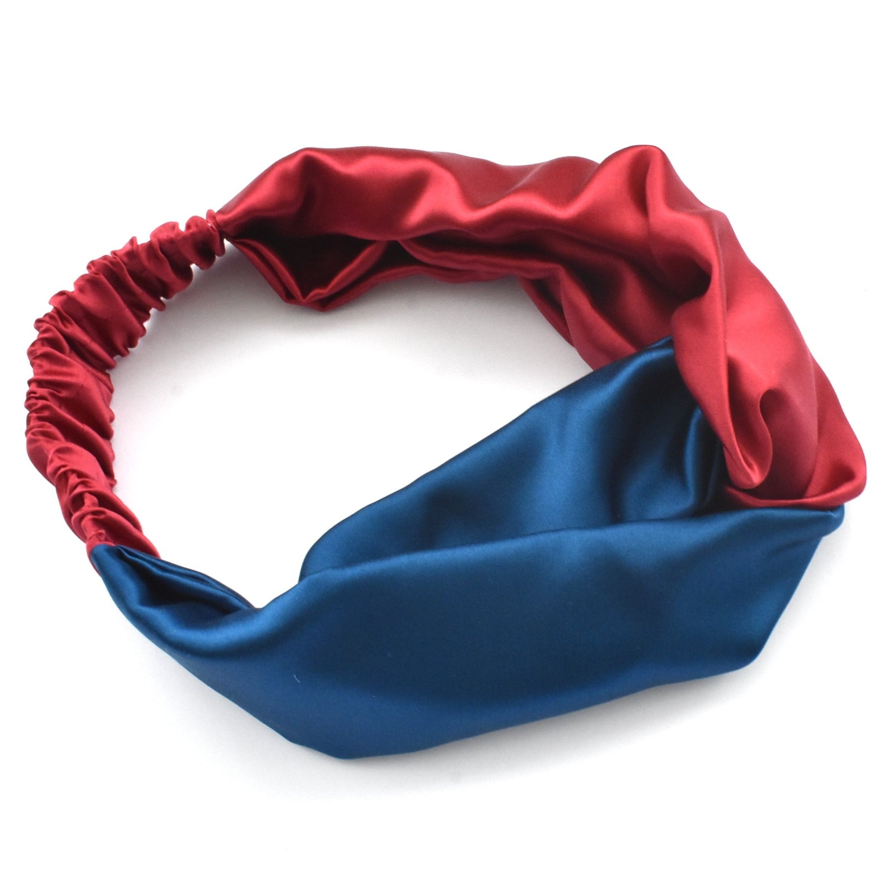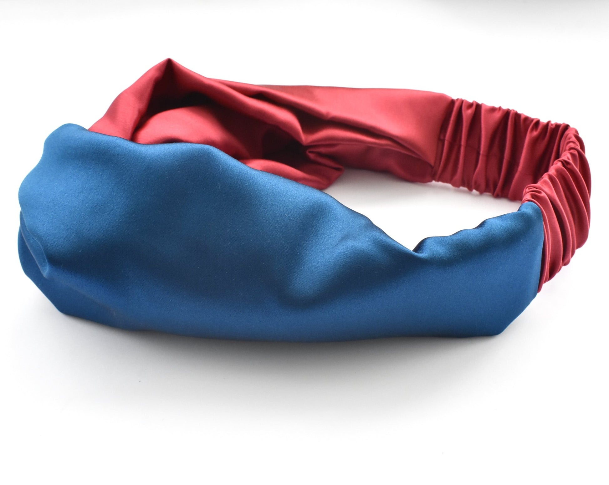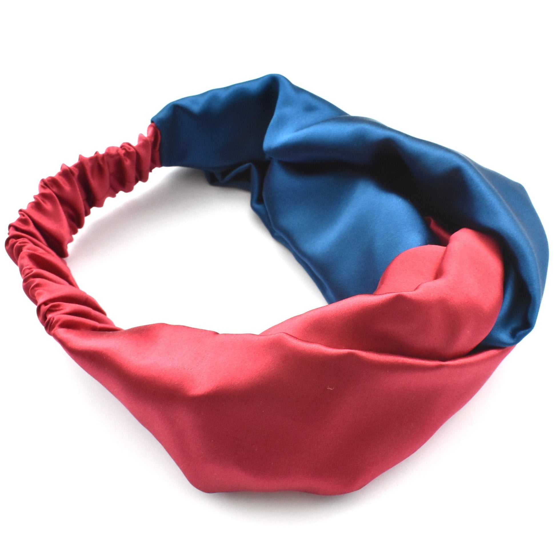 Beautifully handmade and luxuriously wide Split block colour twisted headband in a beautiful rich red and blue tones. We use only the finest 100% Mulberry silk for a super soft and wonderfully luxurious, comfortable and quality finish.
