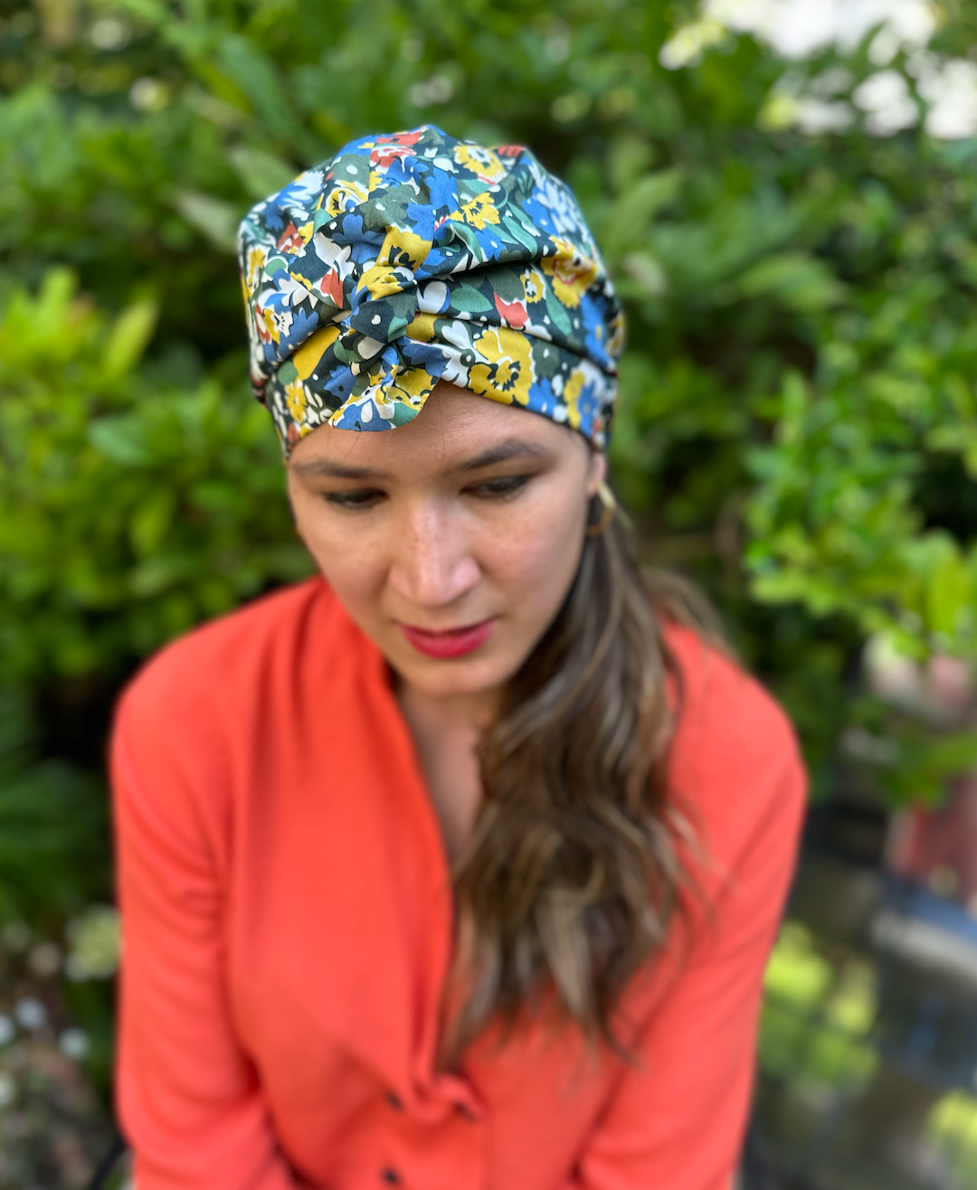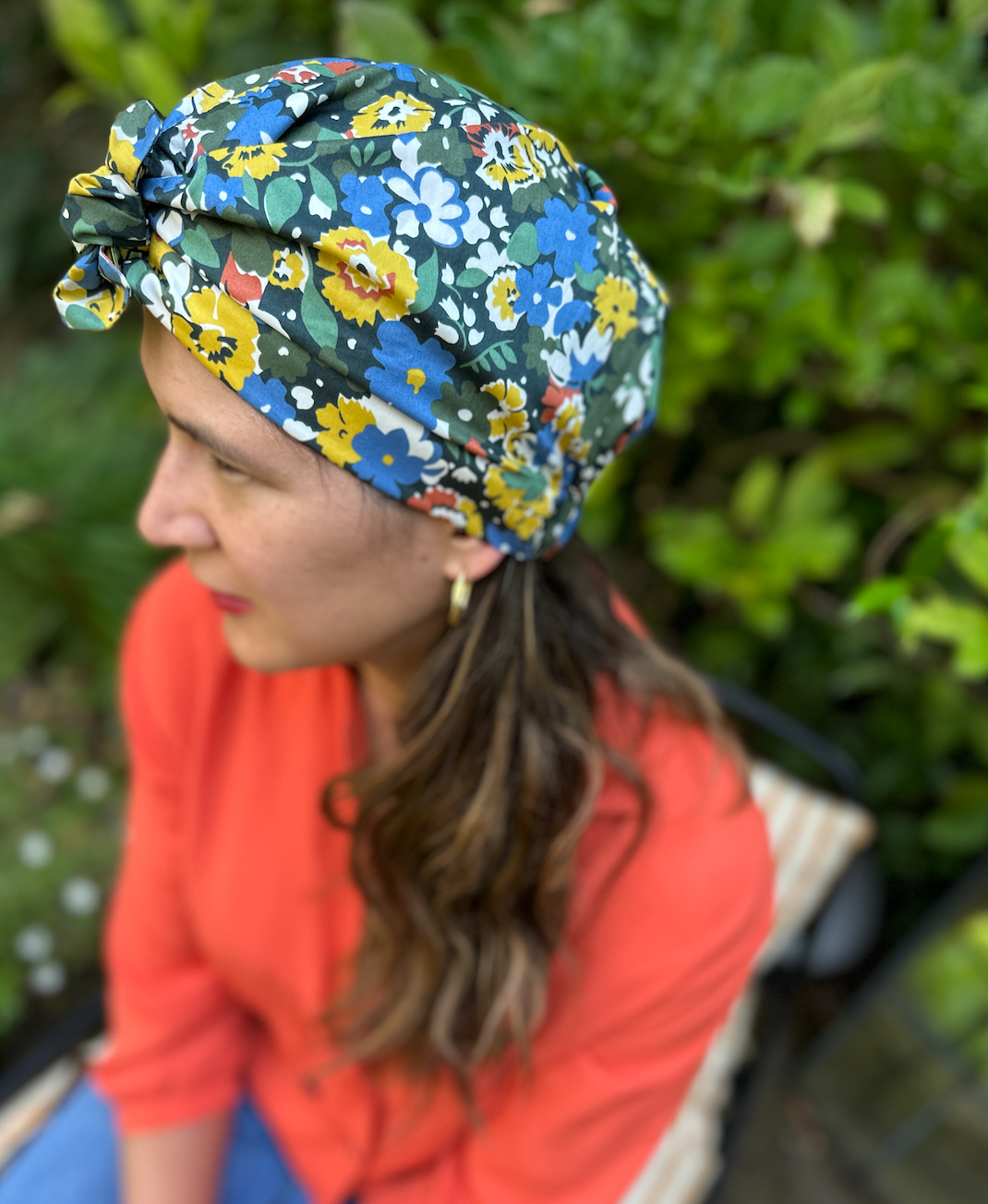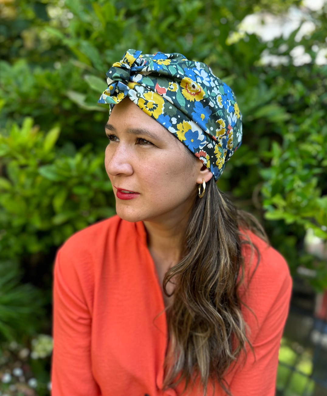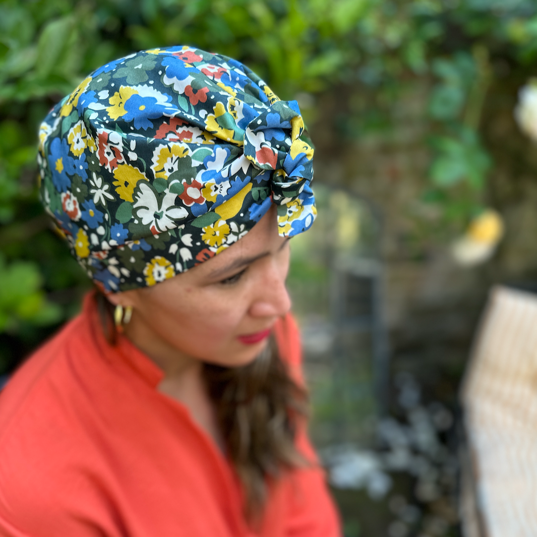 Beautiful handmade turban for women made from the finest Liberty of London Tana Lawn cotton, lined with a choice of 100% pure cotton or 100% pure Mulberry silk for a wonderfully luxurious, comfortable and quality finish.