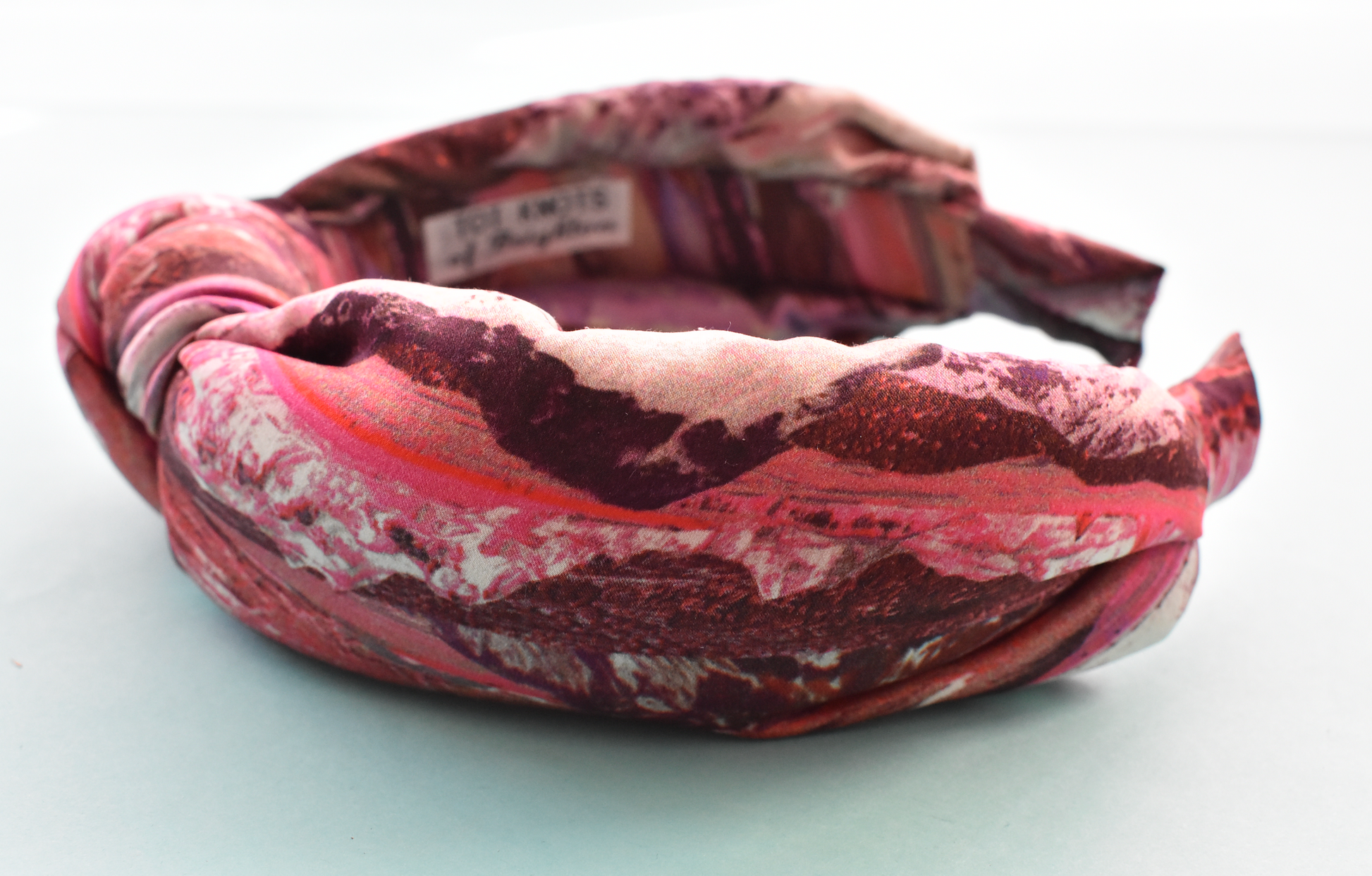 Luxury 100% silk satin headband is super chic, stylish and very grown up. Beautiful Manning mountain range in elegant vibrant pink colours.