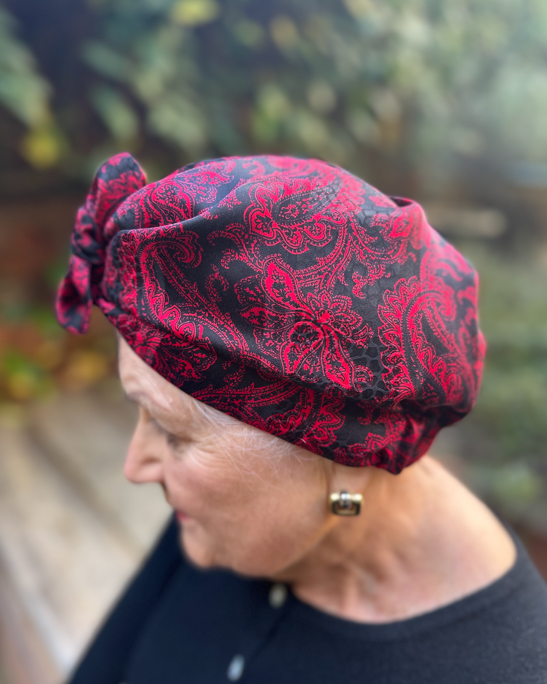 Luxury Silk-Satin Turban in original Liberty London classic paisley print in a rich, vibrant red and black paisley print. A beautiful, original Liberty fabric in 100% Silk-Satin. .